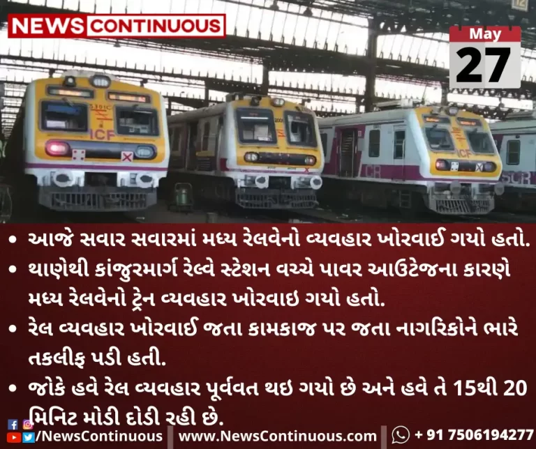 થાણેથી કાંજુરમાર્ગ રેલ્વે સ્ટેશન વચ્ચે પાવર આઉટેજ(Power outage)ના કારણે મધ્ય રેલવેનો ટ્રેન વ્યવહાર ખોરવાઇ ગયો હતો.