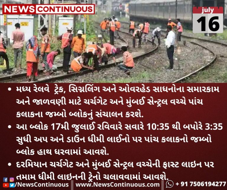 આ બ્લોક 17મી જુલાઈ રવિવારે સવારે 10:35 થી બપોરે 3:35 સુધી અપ અને ડાઉન ધીમી લાઈનો(Up and down slow lines) પર પાંચ કલાકનો જમ્બો બ્લોક હાથ ધરવામાં આવશે.
