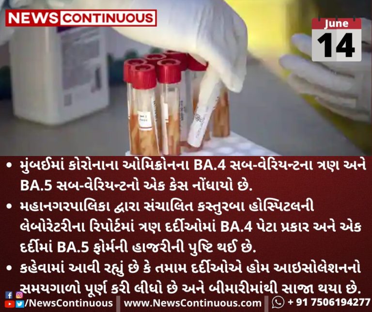 મુંબઈમાં કોરોના વાયરસના ઓમિક્રોનના BA.4 સબ-વેરિયન્ટના ત્રણ અને BA.5 સબ-વેરિયન્ટનો એક કેસ નોંધાયો છે.