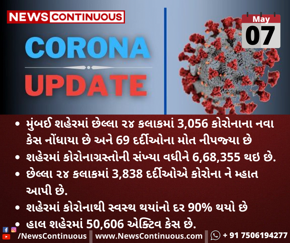 મુંબઈ શહેરમાં છેલ્લા ૨૪ કલાકમાં 3,056 કોરોનાના નવા કેસ નોંધાયા છે અને 69 દર્દીઓના મોત નીપજ્યા છે