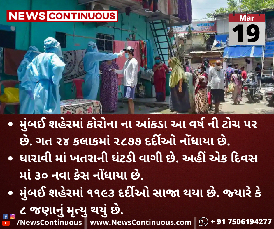 મુંબઈ શહેરમાં કોરોના ના આંકડા આ વર્ષ ની ટોચ પર છે. ગત ૨૪ કલાકમાં ૨૮૭૭ દર્દીઓ નોંધાયા છે.
