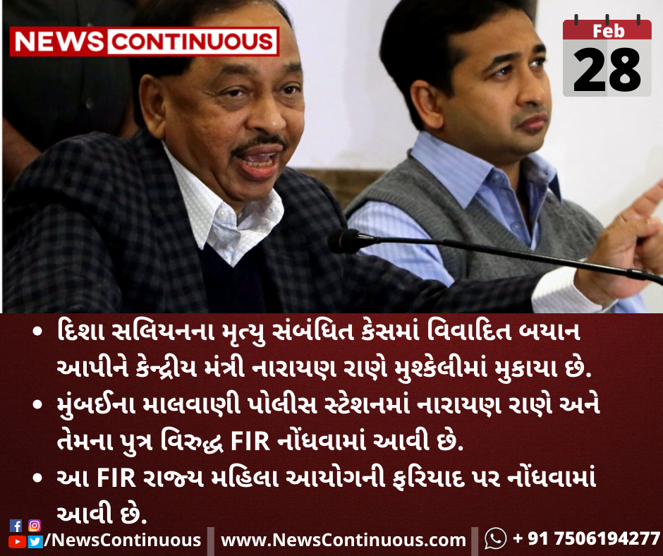 દિશા સલિયનના મૃત્યુ સંબંધિત કેસમાં વિવાદિત બયાન આપીને કેન્દ્રીય મંત્રી નારાયણ રાણે મુશ્કેલીમાં મુકાયા છે.