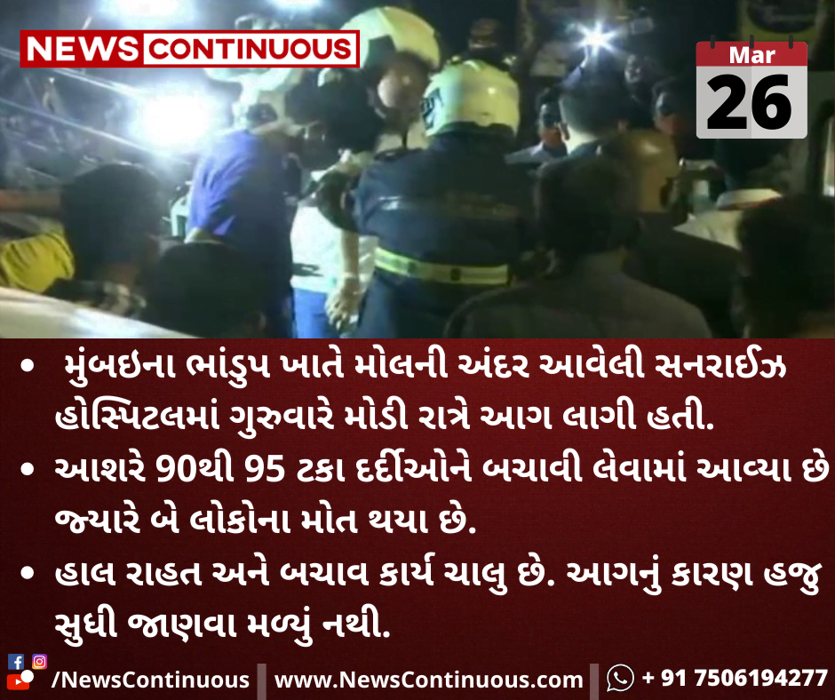 મુંબઇના ભાંડુપ ખાતે મોલની અંદર આવેલી સનરાઈઝ હોસ્પિટલમાં ગુરુવારે મોડી રાત્રે આગ લાગી હતી.