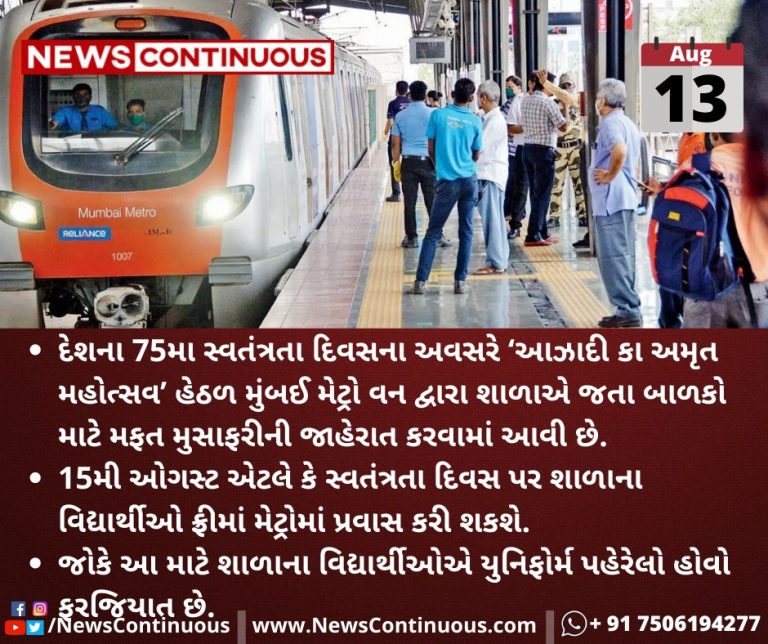દેશના 75મા સ્વતંત્રતા દિવસના(Independence Day) અવસરે ‘આઝાદી કા અમૃત મહોત્સવ’(Azadi ka Amrit Mohotsav) હેઠળ મુંબઈ મેટ્રો વન(Mumbai Metro One) દ્વારા શાળાએ જતા બાળકો માટે મફત મુસાફરીની જાહેરાત કરવામાં આવી છે.