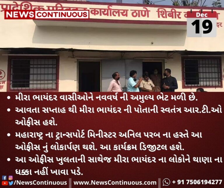 - આવતા સપ્તાહ થી મીરા ભાયંદર ની પોતાની સ્વતંત્ર આર.ટી.ઓ ઓફીસ હશે.