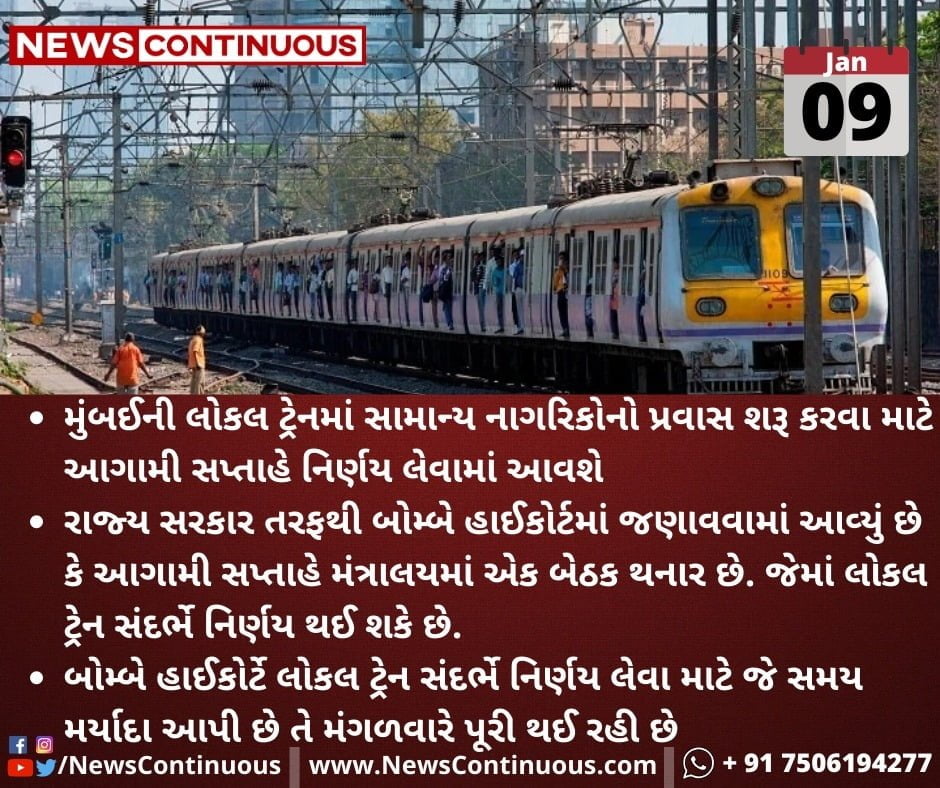- મુંબઈની લોકલ ટ્રેનમાં સામાન્ય નાગરિકોનો પ્રવાસ શરૂ કરવા માટે આગામી સપ્તાહે નિર્ણય લેવામાં આવશે