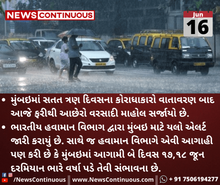 ભારતીય હવામાન વિભાગ દ્વારા મુંબઇ માટે યલો એલર્ટ જારી કરાયું છે. સાથે જ હવામાન વિભાગે એવી આગાહી પણ કરી છે કે મુંબઇમાં આગામી બે દિવસ ૧૭,૧૮ જૂન દરમિયાન ભારે વર્ષા પડે તેવી સંભાવના છે.