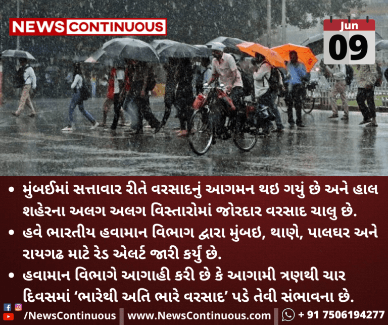 હવે ભારતીય હવામાન વિભાગ દ્વારા મુંબઇ, થાણે, પાલઘર અને રાયગઢ માટે રેડ એલર્ટ જારી કર્યું છે.