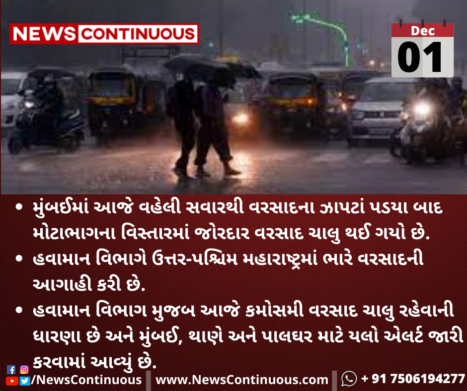 હવામાન વિભાગ મુજબ આજે કમોસમી વરસાદ ચાલુ રહેવાની ધારણા છે અને મુંબઈ, થાણે અને પાલઘર માટે યલો એલર્ટ જારી કરવામાં આવ્યું છે.