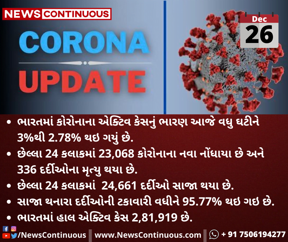 - છેલ્લા 24 કલાકમાં 23,068 કોરોનાના નવા નોંધાયા છે અને 336 દર્દીઓના મૃત્યુ થયા છે.