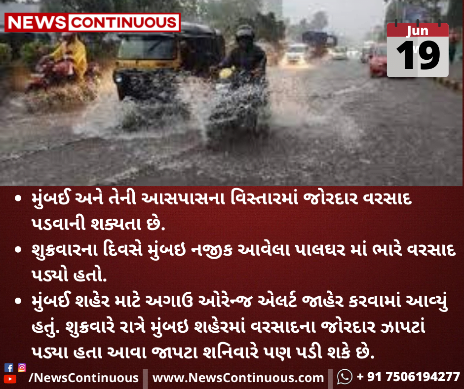 મુંબઈ શહેર માટે અગાઉ ઓરેન્જ એલર્ટ જાહેર કરવામાં આવ્યું હતું. શુક્રવારે રાત્રે મુંબઇ શહેરમાં વરસાદના જોરદાર ઝાપટાં પડ્યા હતા આવા જાપટા શનિવારે પણ પડી શકે છે.