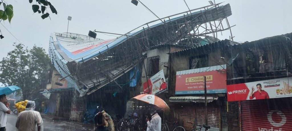 મુંબઈ શહેરના ખાર પૂર્વ વિસ્તારમાં જય હિન્દ નગર તેમ જ નિર્મલ નગર જંક્શનના રસ્તા પર એક બહુ મોટું હોર્ડિંગ કે બોર્ડ મૂકવામાં આવ્યું હતું. જે જોરદાર પવન ફૂંકાવાને કારણે આ હજારો કિલોનું પતરા અને લોખંડથી બનેલું બોર્ડ સીધેસીધું રસ્તા પર તૂટી પડ્યું.