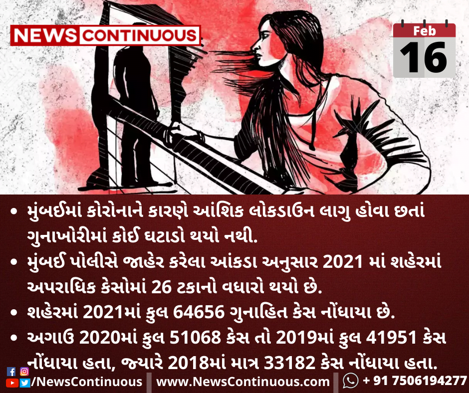 મુંબઈ પોલીસે જાહેર કરેલા આંકડા અનુસાર 2021 માં શહેરમાં અપરાધિક કેસોમાં 26 ટકાનો વધારો થયો છે.