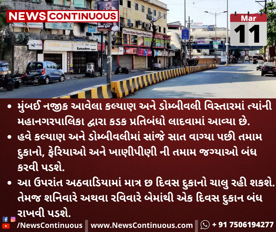 હવે કલ્યાણ અને ડોમ્બીવલીમાં સાંજે સાત વાગ્યા પછી તમામ દુકાનો, ફેરિયાઓ અને ખાણીપીણી ની તમામ જગ્યાઓ બંધ કરવી પડશે.