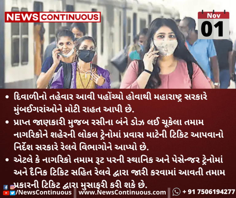 પ્રાપ્ત જાણકારી મુજબ રસીના બંને ડોઝ લઈ ચૂકેલા તમામ નાગરિકોને શહેરની લોકલ ટ્રેનોમાં પ્રવાસ માટેની ટિકિટ આપવાનો નિર્દેશ સરકારે રેલવે વિભાગોને આપ્યો છે.