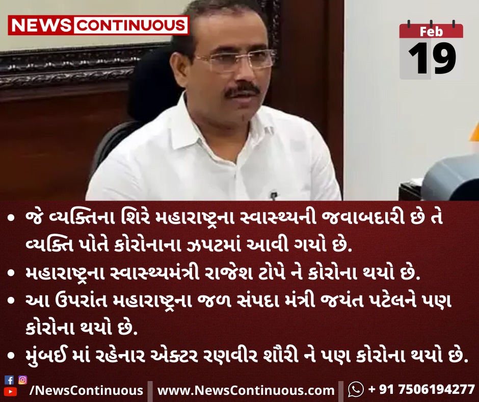 મહારાષ્ટ્રના સ્વાસ્થ્યમંત્રી રાજેશ ટોપે ને કોરોના થયો છે. આ ઉપરાંત મહારાષ્ટ્રના જળ સંપદા મંત્રી જયંત પટેલને પણ કોરોના થયો છે.
