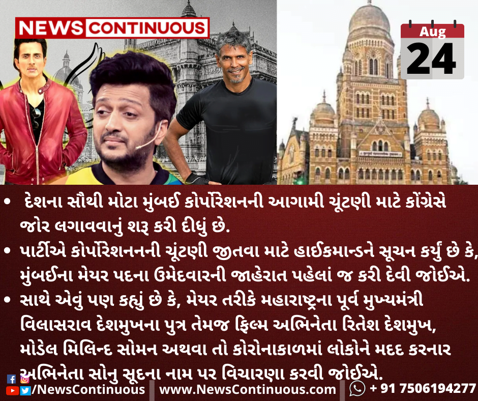 પાર્ટીએ કોર્પોરેશનનની ચૂંટણી જીતવા માટે હાઈકમાન્ડને સૂચન કર્યું છે કે, મુંબઈના મેયર પદના ઉમેદવારની જાહેરાત પહેલાં જ કરી દેવી જોઈએ