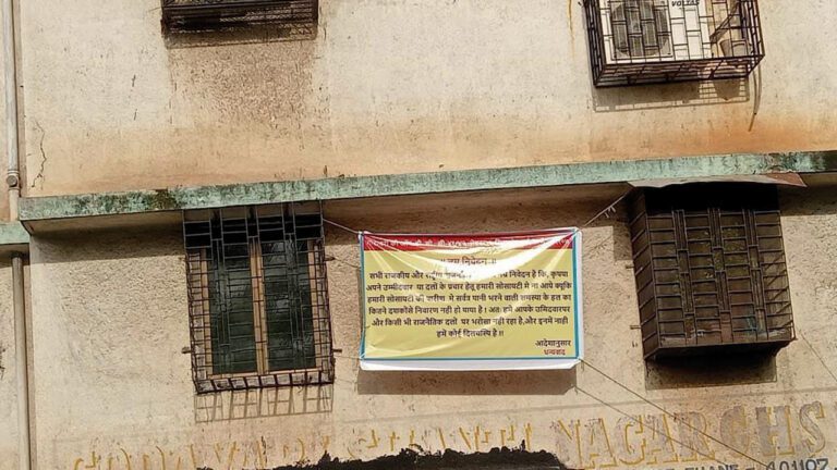 છેલ્લા ત્રણ દાયકા કરતાં વધુ સમયથી ચોમાસા દરમિયાન દર વર્ષે નિયમિતપણે પાણી ભરાવાની સમસ્યાનો સામનો કરતા મીરા રોડ સ્થિત એક હાઉસિંગ સોસાયટીએ એક અનોખું પગલું ભર્યું છે. સોસાયટીએ રાજકીય પક્ષોના સભ્યો અને તેમના ઉમેદવારોને કોઈપણ પ્રકારના પ્રચાર માટે તેમના પરિસરમાં પ્રવેશ ન કરવા વિનંતી કરતું એક બૅનર લગાવ્યું છે. રહેવાસીઓ કહે છે કે તેમને હવે નેતાઓની ખાતરીઓ અને વચનો પર વિશ્વાસ રહ્યો નથી.