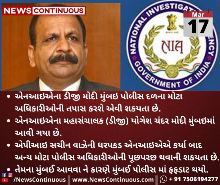 એનઆઇએના ડીજી મોદી મુંબઇ પોલીસ દળના મોટા અધિકારીઓની તપાસ કરશે એવી શકયતા છે.