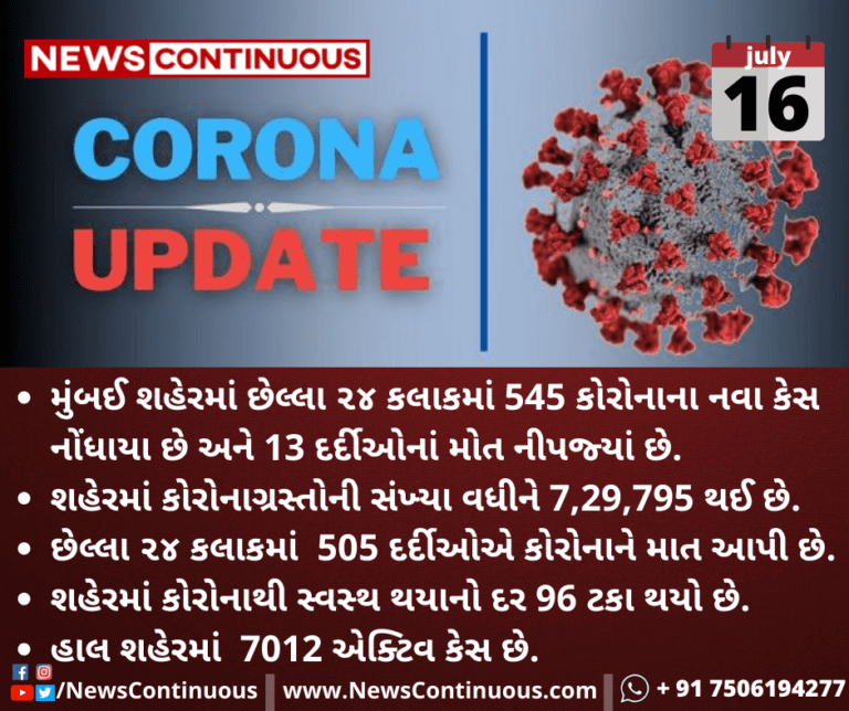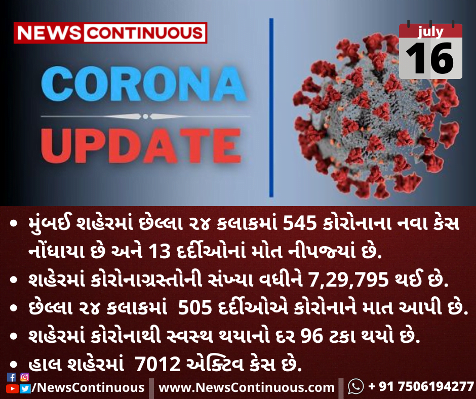 મુંબઈ શહેરમાં છેલ્લા ૨૪ કલાકમાં 545 કોરોનાના નવા કેસ નોંધાયા છે અને 13 દર્દીઓનાં મોત નીપજ્યાં છે.