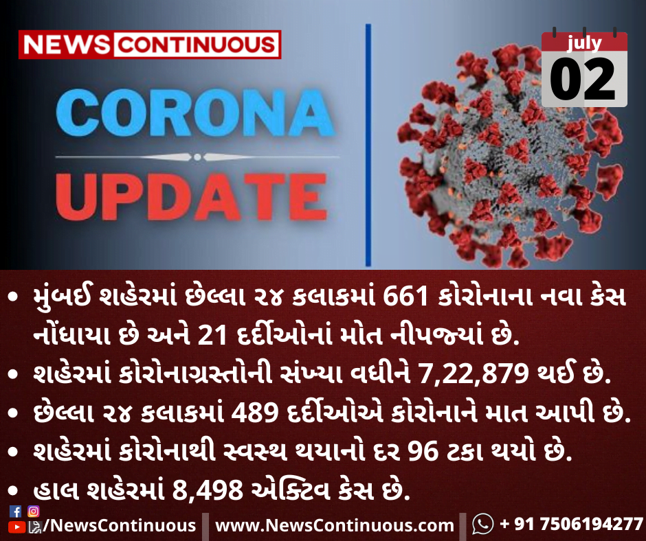 મુંબઈ શહેરમાં છેલ્લા ૨૪ કલાકમાં 661 કોરોનાના નવા કેસ નોંધાયા છે અને 21 દર્દીઓનાં મોત નીપજ્યાં છે.