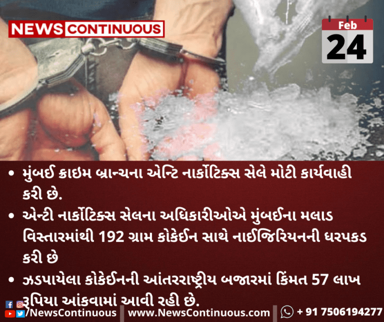 એન્ટી નાર્કોટિક્સ સેલના અધિકારીઓએ મુંબઈના મલાડ વિસ્તારમાંથી 192 ગ્રામ કોકેઈન સાથે નાઈજિરિયનની ધરપકડ કરી છે