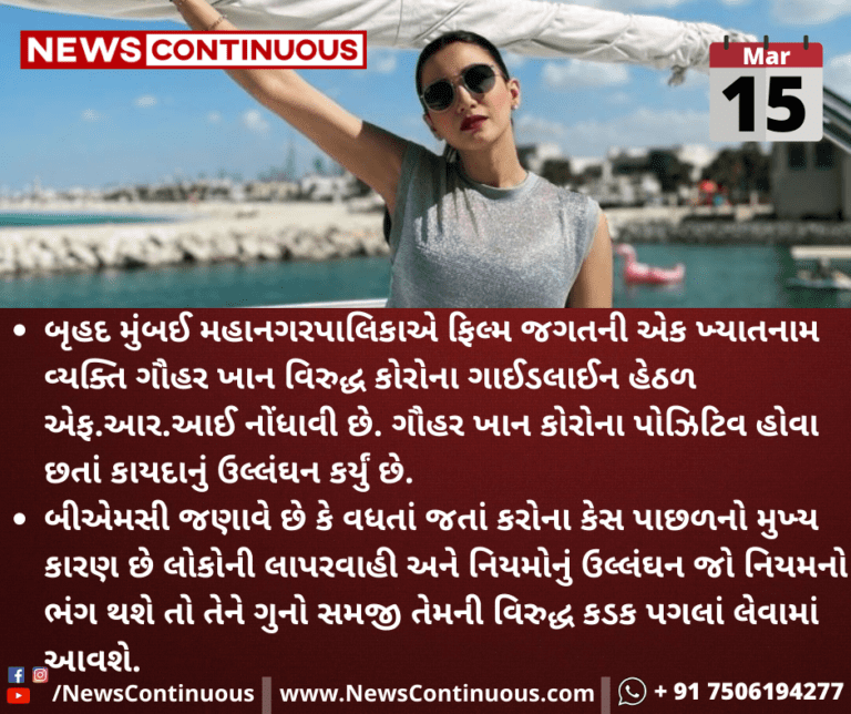 બૃહદ મુંબઈ મહાનગરપાલિકાએ ફિલ્મ જગતની એક ખ્યાતનામ વ્યક્તિ ગૌહર ખાન વિરુદ્ધ કોરોના ગાઈડલાઈન હેઠળ એફ.આર.આઈ નોંધાવી છે.