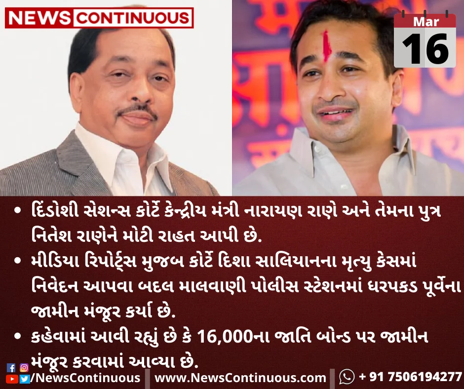 દિંડોશી સેશન્સ કોર્ટે કેન્દ્રીય મંત્રી નારાયણ રાણે અને તેમના પુત્ર નિતેશ રાણેને મોટી રાહત આપી છે.