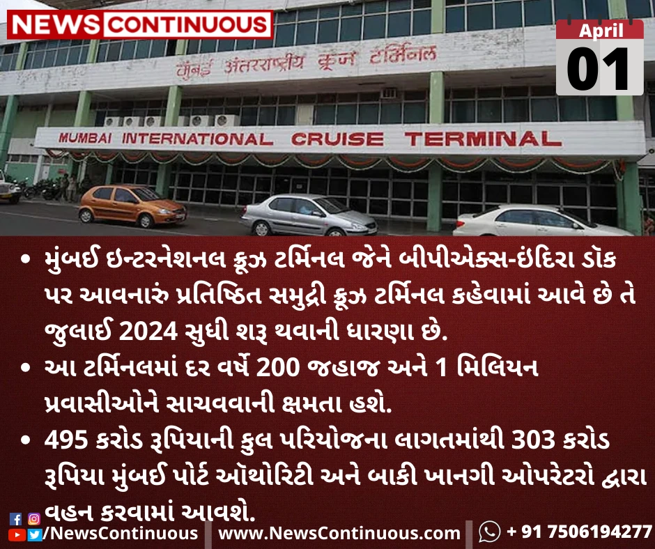 મુંબઈ ઇન્ટરનેશનલ ક્રૂઝ ટર્મિનલ જેને બીપીએક્સ-ઇંદિરા ડૉક પર આવનારું પ્રતિષ્ઠિત સમુદ્રી ક્રૂઝ ટર્મિનલ કહેવામાં આવે છે તે જુલાઈ 2024 સુધી શરૂ થવાની ધારણા છે.