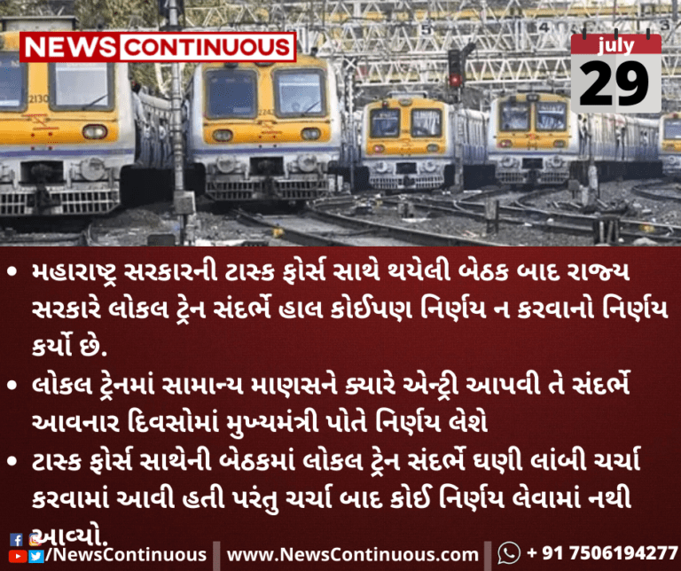 મહારાષ્ટ્ર સરકારની ટાસ્ક ફોર્સ સાથે થયેલી બેઠક બાદ રાજ્ય સરકારે લોકલ ટ્રેન સંદર્ભે હાલ કોઈપણ નિર્ણય ન કરવાનો નિર્ણય કર્યો છે.