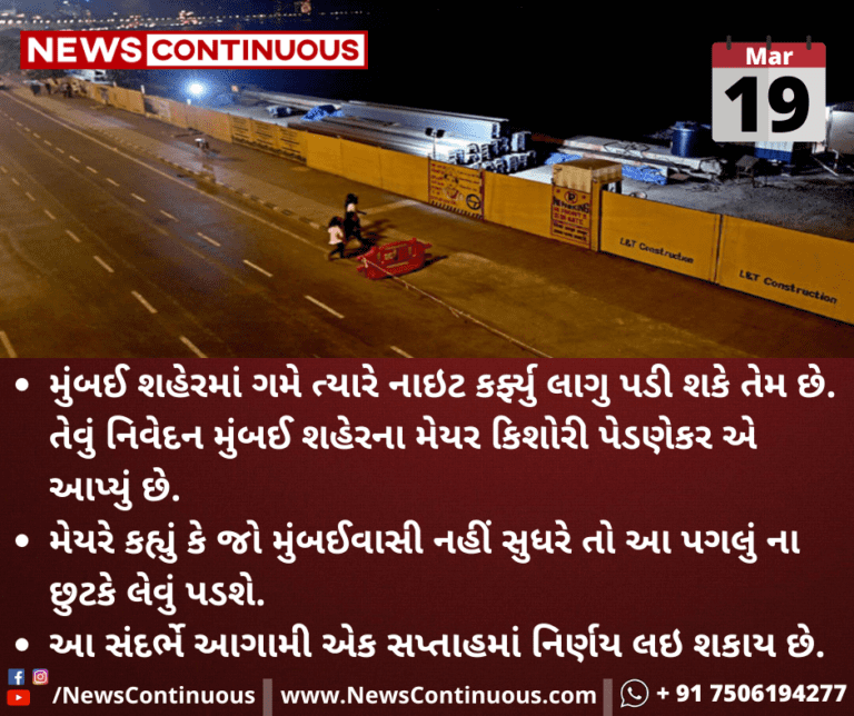 મુંબઈ શહેરમાં ગમે ત્યારે નાઇટ કર્ફ્યુ લાગુ પડી શકે તેમ છે. તેવું નિવેદન મુંબઈ શહેરના મેયર કિશોરી પેડણેકર એ આપ્યું છે.
