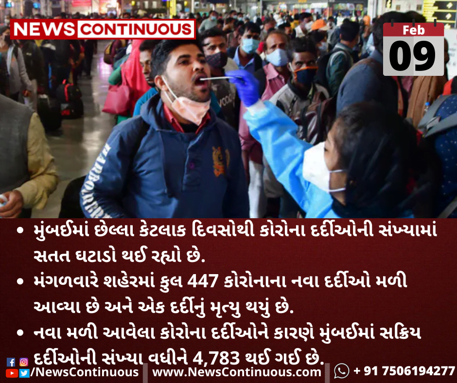 નવા મળી આવેલા કોરોના દર્દીઓને કારણે મુંબઈમાં સક્રિય દર્દીઓની સંખ્યા વધીને 4,783 થઈ ગઈ છે.