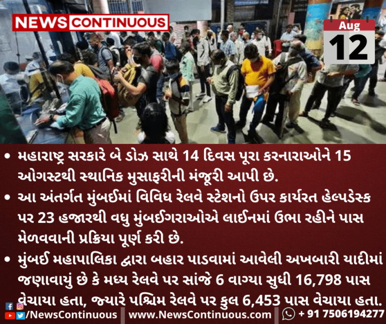મહારાષ્ટ્ર સરકારે બે ડોઝ સાથે 14 દિવસ પૂરા કરનારાઓને 15 ઓગસ્ટથી સ્થાનિક મુસાફરીની મંજૂરી આપી છે.