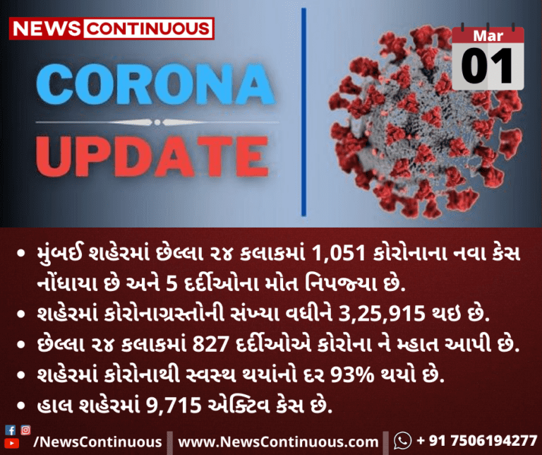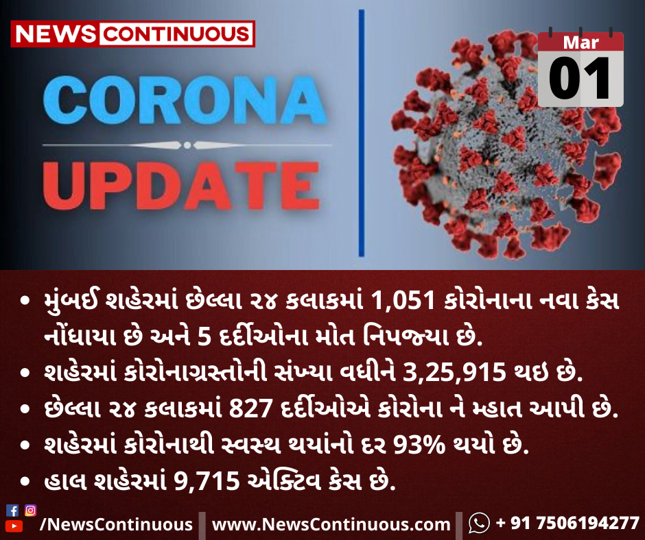 મુંબઈ શહેરમાં છેલ્લા ૨૪ કલાકમાં 1,051 કોરોનાના નવા કેસ નોંધાયા છે અને 5 દર્દીઓના મોત નિપજ્યા છે
