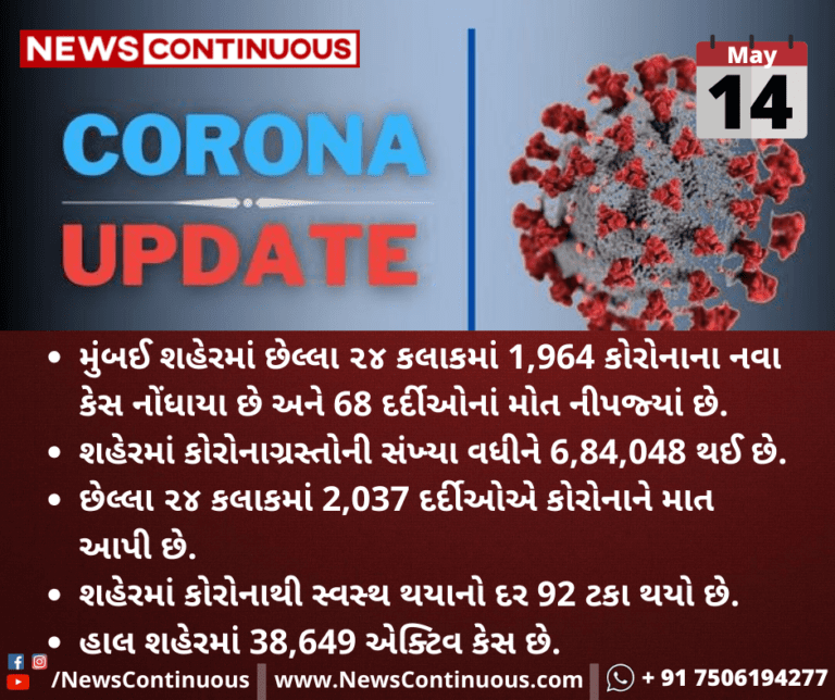 મુંબઈ શહેરમાં છેલ્લા ૨૪ કલાકમાં 1,964 કોરોનાના નવા કેસ નોંધાયા છે અને 68 દર્દીઓનાં મોત નીપજ્યાં છે.