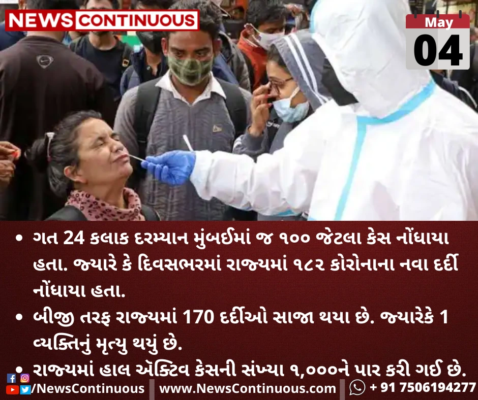 ગત 24 કલાક દરમ્યાન મુંબઈમાં(Mumbai) જ ૧૦૦ જેટલા કેસ(Covid19 cases) નોંધાયા હતા. જ્યારે કે દિવસભરમાં રાજ્યમાં ૧૮૨ કોરોનાના(Covid19 patients) નવા દર્દી નોંધાયા હતા.