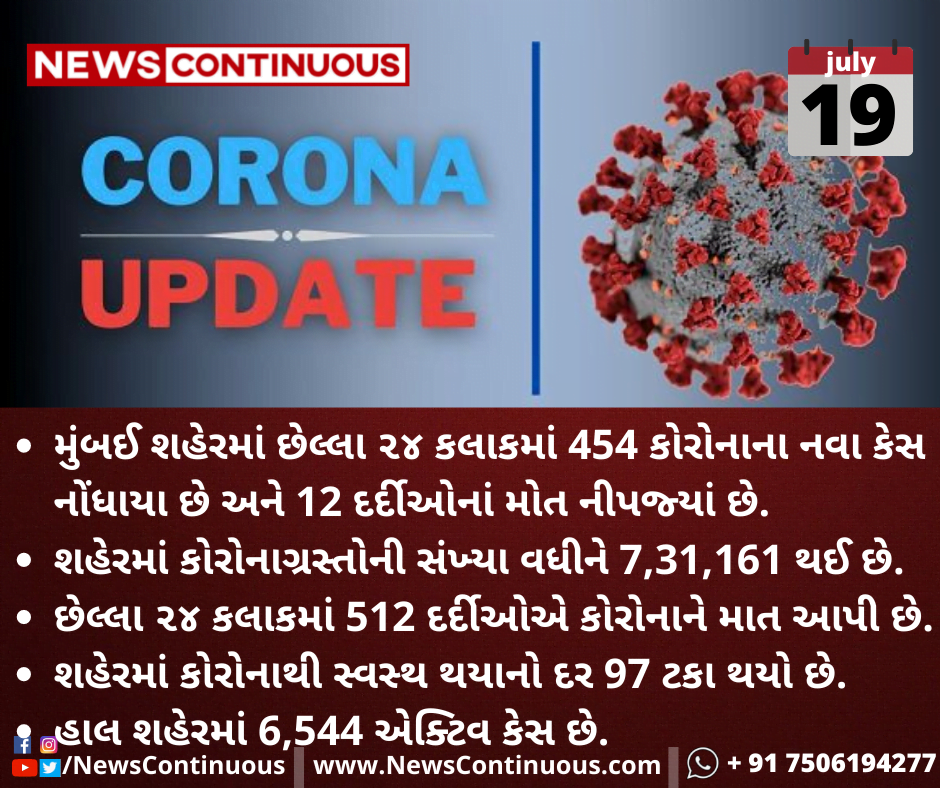 મુંબઈ શહેરમાં છેલ્લા ૨૪ કલાકમાં 454 કોરોનાના નવા કેસ નોંધાયા છે અને 12 દર્દીઓનાં મોત નીપજ્યાં છે.