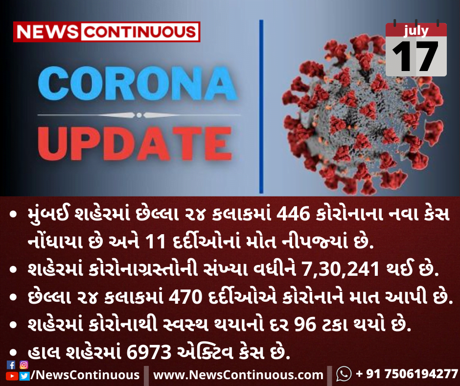 મુંબઈ શહેરમાં છેલ્લા ૨૪ કલાકમાં 446 કોરોનાના નવા કેસ નોંધાયા છે અને 11 દર્દીઓનાં મોત નીપજ્યાં છે.