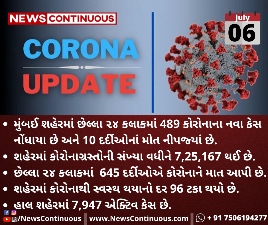 મુંબઈ શહેરમાં છેલ્લા ૨૪ કલાકમાં 489 કોરોનાના નવા કેસ નોંધાયા છે અને 10 દર્દીઓનાં મોત નીપજ્યાં છે.