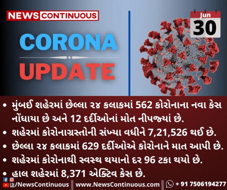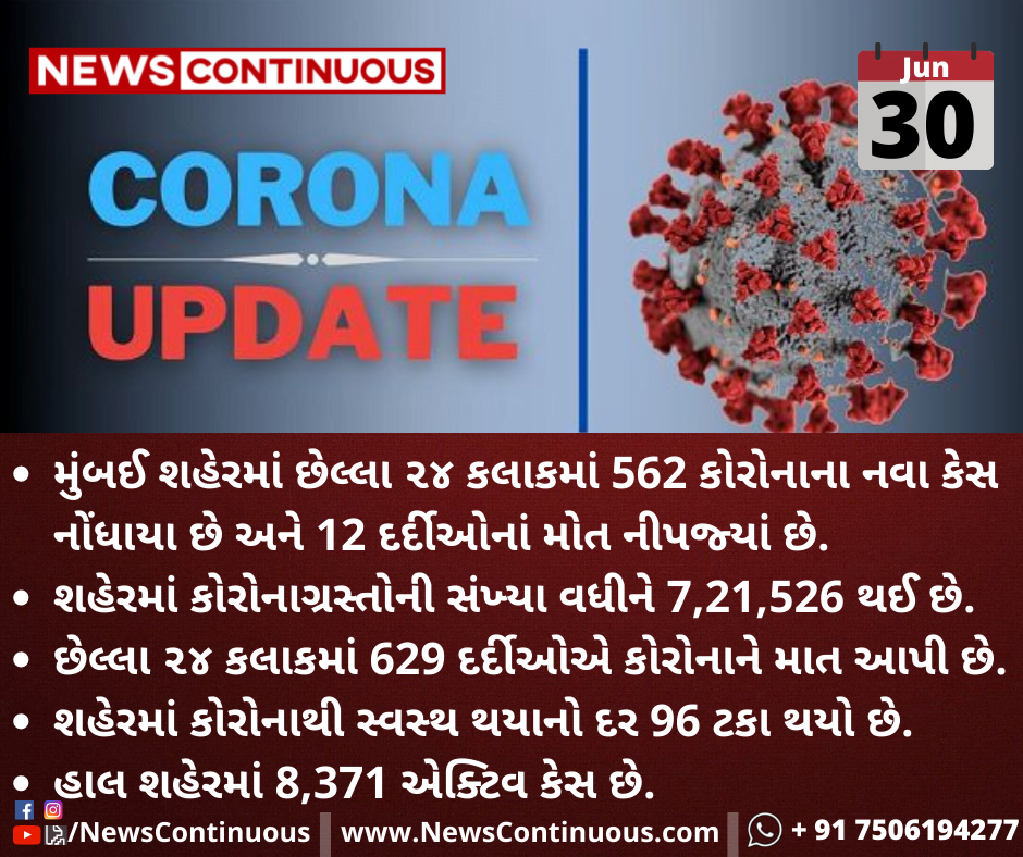 મુંબઈ શહેરમાં છેલ્લા ૨૪ કલાકમાં 562 કોરોનાના નવા કેસ નોંધાયા છે અને 12 દર્દીઓનાં મોત નીપજ્યાં છે.