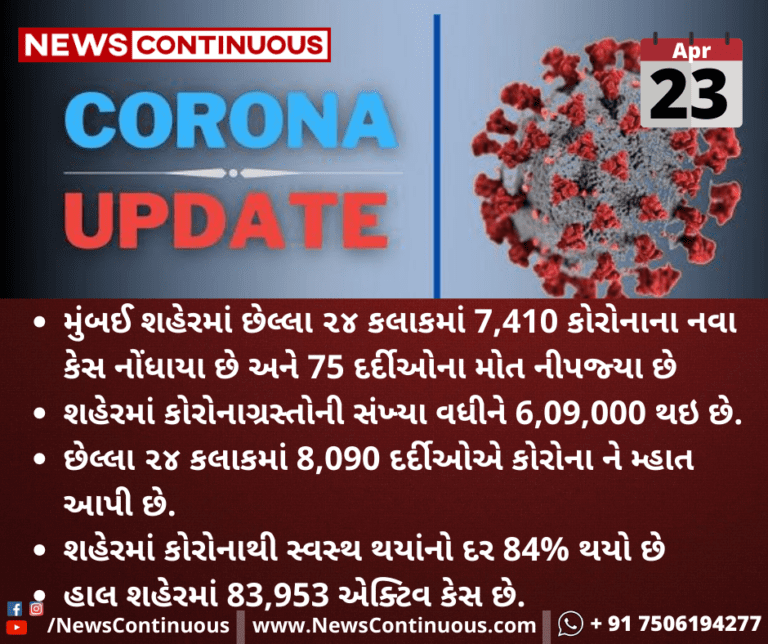 મુંબઈ શહેરમાં છેલ્લા ૨૪ કલાકમાં 7,410 કોરોનાના નવા કેસ નોંધાયા છે અને 75 દર્દીઓના મોત નીપજ્યા છે