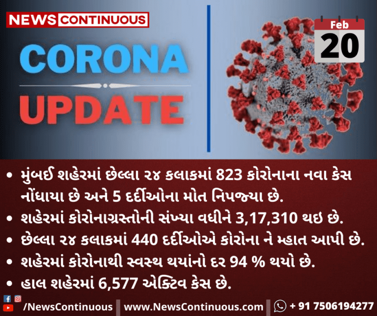 મુંબઈ શહેર માં છેલ્લા ૨૪ કલાકમાં 823 કોરોનાના નવા કેસ નોંધાયા છે અને 5 દર્દીઓના મોત નિપજ્યા છે