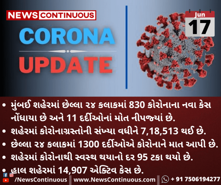 મુંબઈ શહેરમાં છેલ્લા ૨૪ કલાકમાં 830 કોરોનાના નવા કેસ નોંધાયા છે અને 11 દર્દીઓનાં મોત નીપજ્યાં છે.