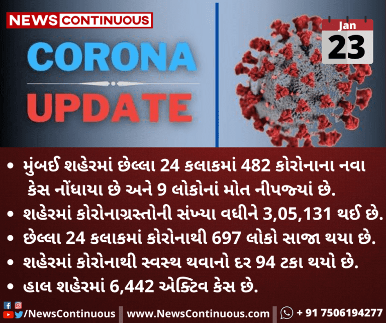 મુંબઈ શહેરમાં છેલ્લા 24 કલાકમાં 482 કોરોનાના નવા કેસ નોંધાયા છે અને 9 લોકોનાં મોત નીપજ્યાં છે.