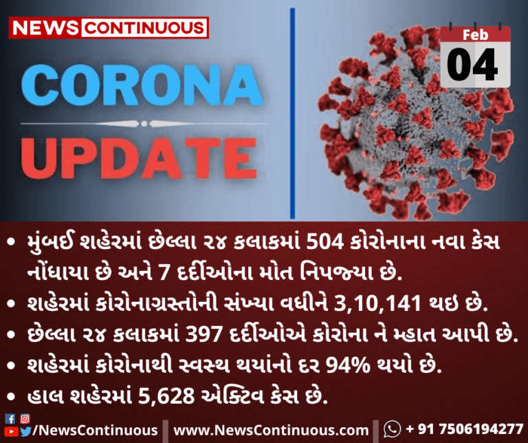 મુંબઈ શહેરમાં છેલ્લા ૨૪ કલાકમાં 504 કોરોનાના નવા કેસ નોંધાયા છે અને 7 દર્દીઓના મોત નિપજ્યા છે