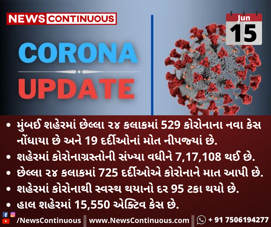 મુંબઈ શહેરમાં છેલ્લા ૨૪ કલાકમાં 529 કોરોનાના નવા કેસ નોંધાયા છે અને 19 દર્દીઓનાં મોત નીપજ્યાં છે.