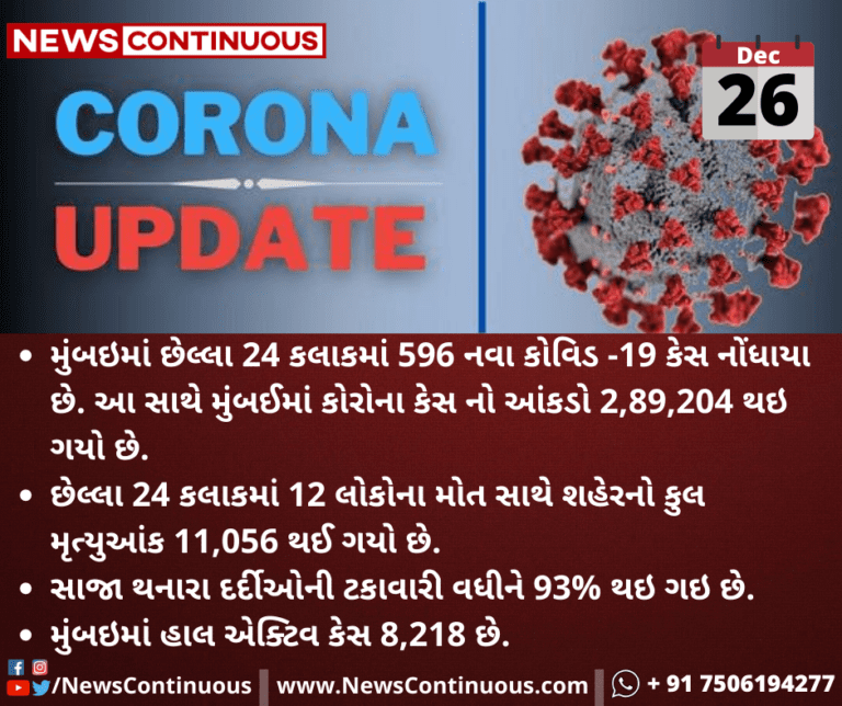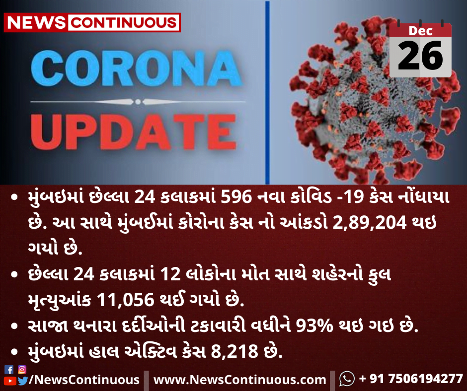 - મુંબઇમાં છેલ્લા 24 કલાકમાં 596 નવા કોવિડ -19 કેસ નોંધાયા છે