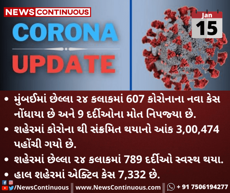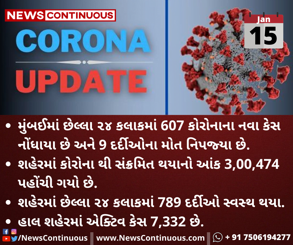 - મુંબઈમાં છેલ્લા ૨૪ કલાકમાં 607 કોરોનાના નવા કેસ નોંધાયા છે અને 9 દર્દીઓના મોત નિપજ્યા છે.