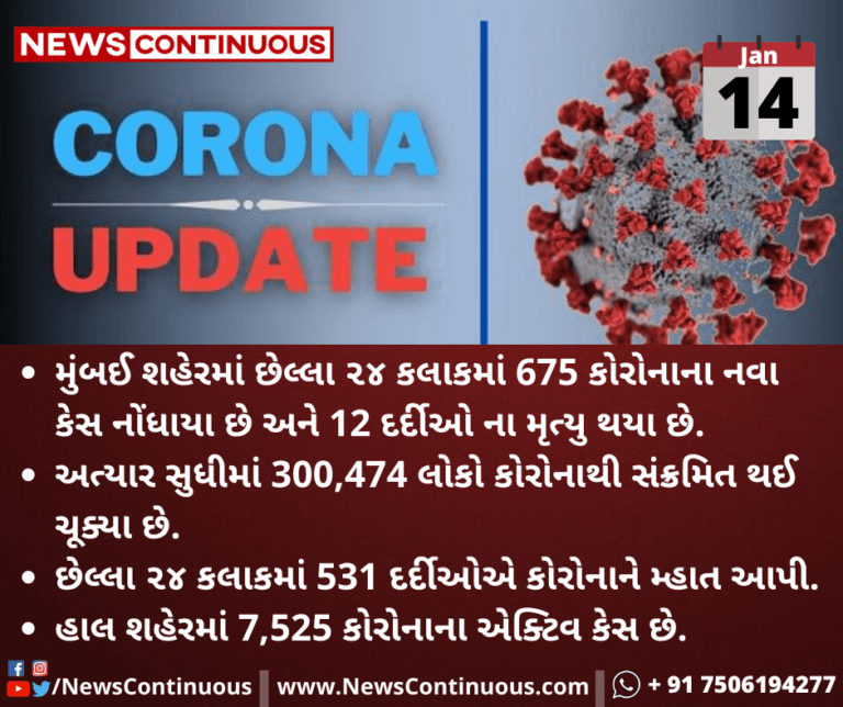 મુંબઈ શહેરમાં છેલ્લા ૨૪ કલાકમાં 675 કોરોના નવા કેસ નોંધાયા છે અને 12 દર્દીઓ ના મૃત્યુ થયા છે.