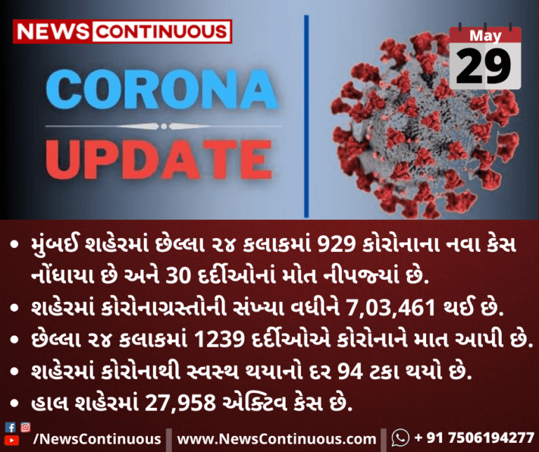 મુંબઈ શહેરમાં છેલ્લા ૨૪ કલાકમાં 929 કોરોનાના નવા કેસ નોંધાયા છે અને 30 દર્દીઓનાં મોત નીપજ્યાં છે.